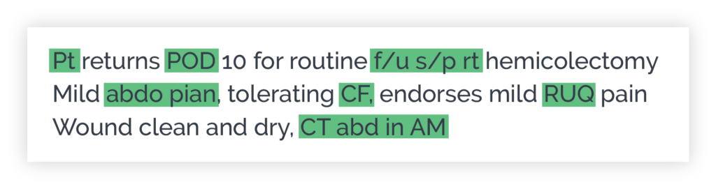 A surgical note is often full of abbreviations and acronyms. However, a well-trained NLP solution should be able to read the above as: “Patient returns, postoperative day 10 for routine follow-up status post right hemicolectomy. Mild abdominal pain, tolerating clear fluids, endorses mild right upper quadrant pain. Wound clean and dry, CT of abdomen scheduled in the morning.”