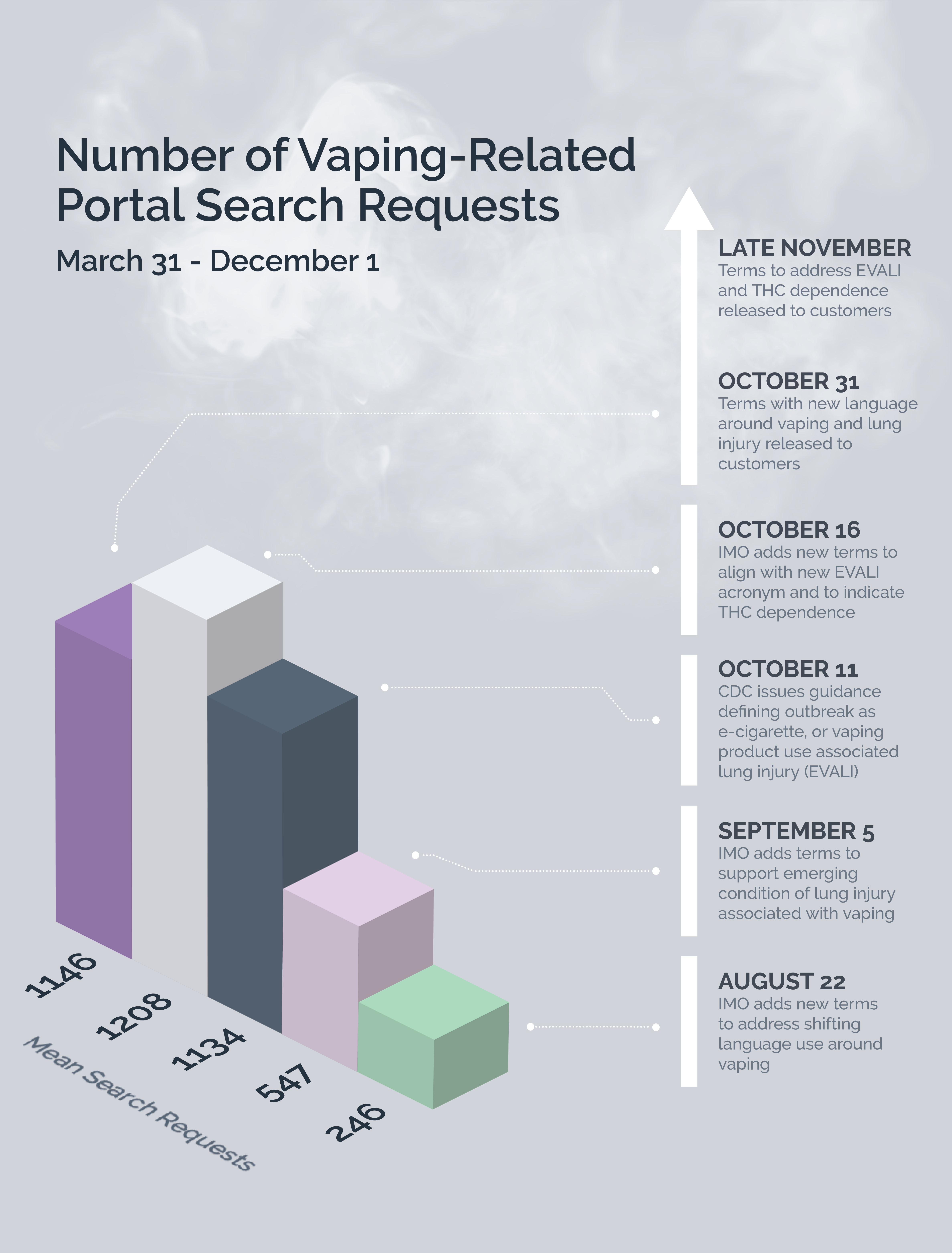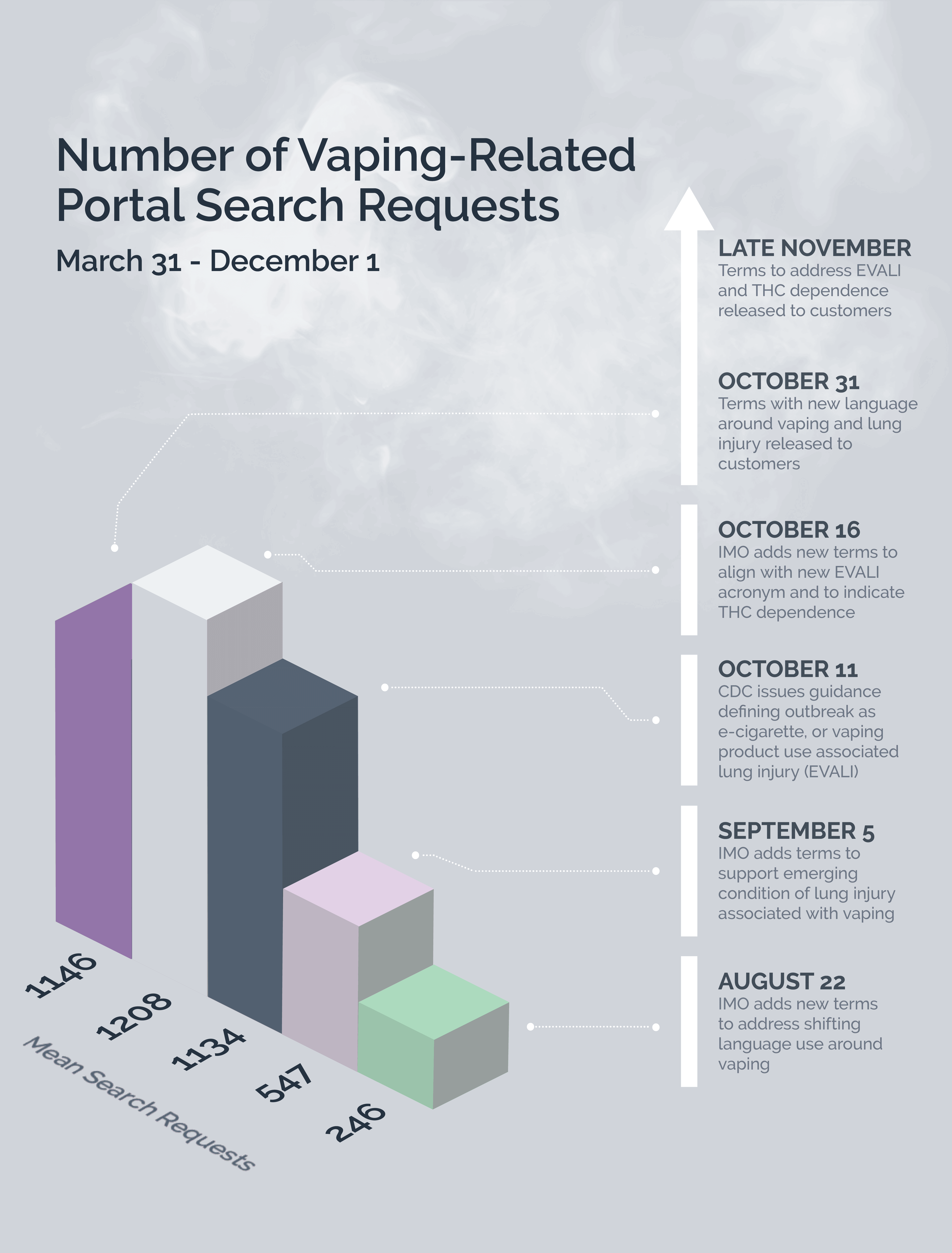 Cognizant of the need for our terminology products to continually evolve, IMO will release a terminology update that specifically addresses new vaping concerns. This upcoming release ensures our products continue to help providers correctly collect, chart, and report information about vaping related illnesses, and thus help to avoid delays in treatment due to documentation limitations.